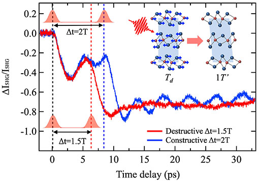 本研究室では、10フェムト秒(1フェムト秒は1000兆分の1秒)程度の超短パルスレーザーを用いた超高速光物性に関する基礎的・応用的研究を行っています。 具体的には、二次元層状材料などの結晶中に位相の揃った格子振動(コヒーレントフォノン)を励起して、